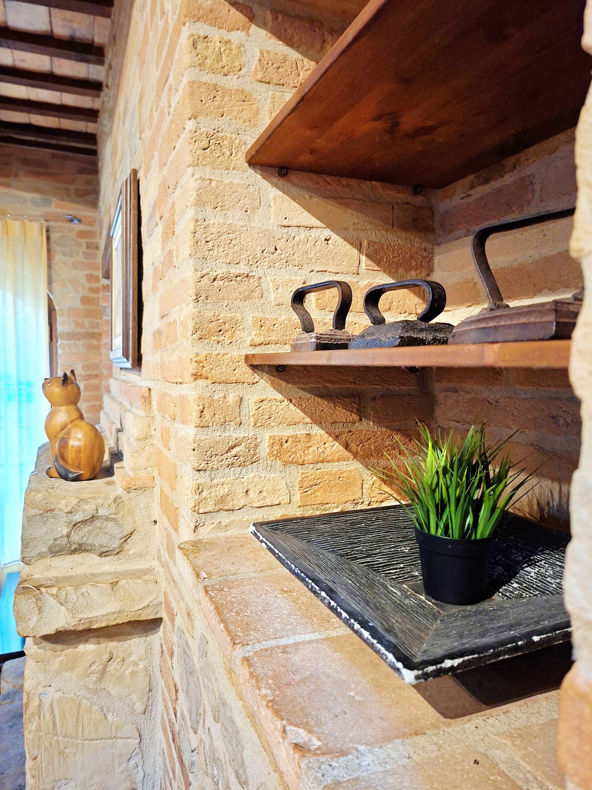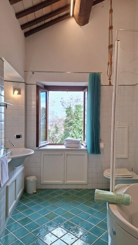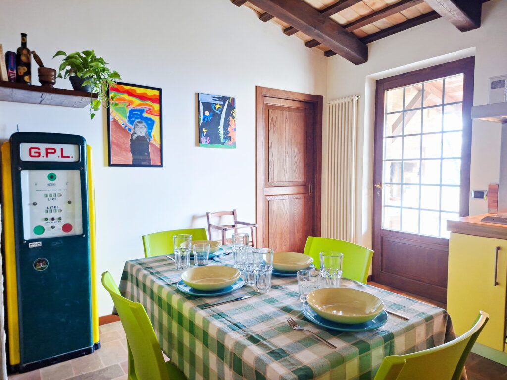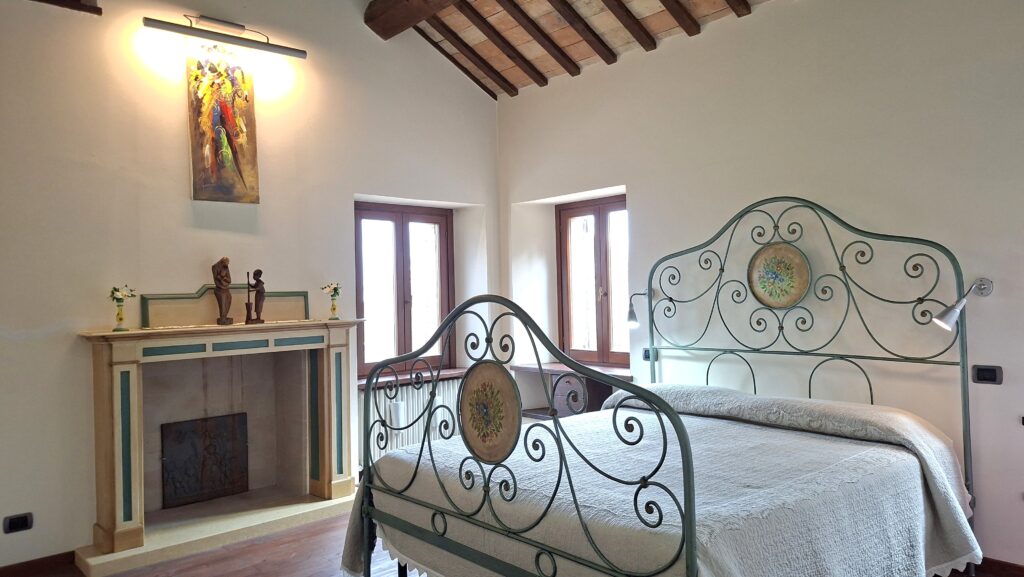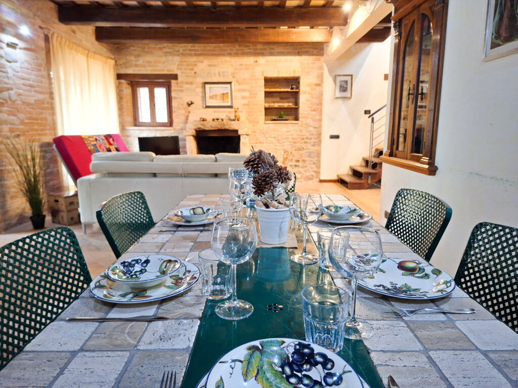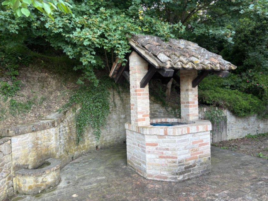 Dal giardino esterno, all’antico pozzo, al forno a legna, alle mura in pietra e mattone cotto, tutto comunica un senso di quiete e pace. Il paese medievale di Montegiorgio, a pochi passi, fa da cornice al panorama.